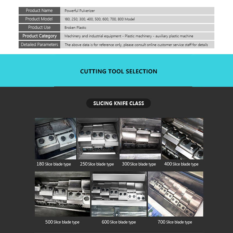 5HP 250F 4KW pulverizatorius naudoja legiruotojo plieno ašmenis, ilgas tarnavimo laikas; tuo pačiu metu mašina turi atskirą dizainą, kurį lengva pataisyti ir išvalyti, ir jis yra dviejų sluoksnių. Jis aprūpintas garsui nepralaidžiomis medžiagomis ir turi mažą triukšmą. Peilio veleno sėdynė yra griežtai subalansuota. Bandymui mašinos pagrindas yra su keturiais ratais ir yra lengvai perkeliamas. Tai geriausias pasirinkimas visiems plastiko pramonės pirkėjams.